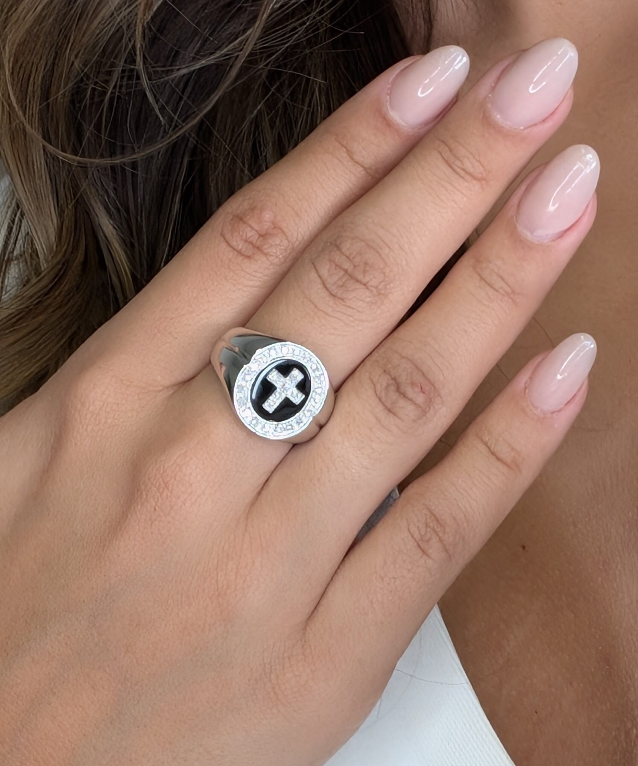 Anillo (0.25 Ct) c/ Ovalo & Cruz de Diamantes Pave Sobre Onix – Oro Blanco 14Kts