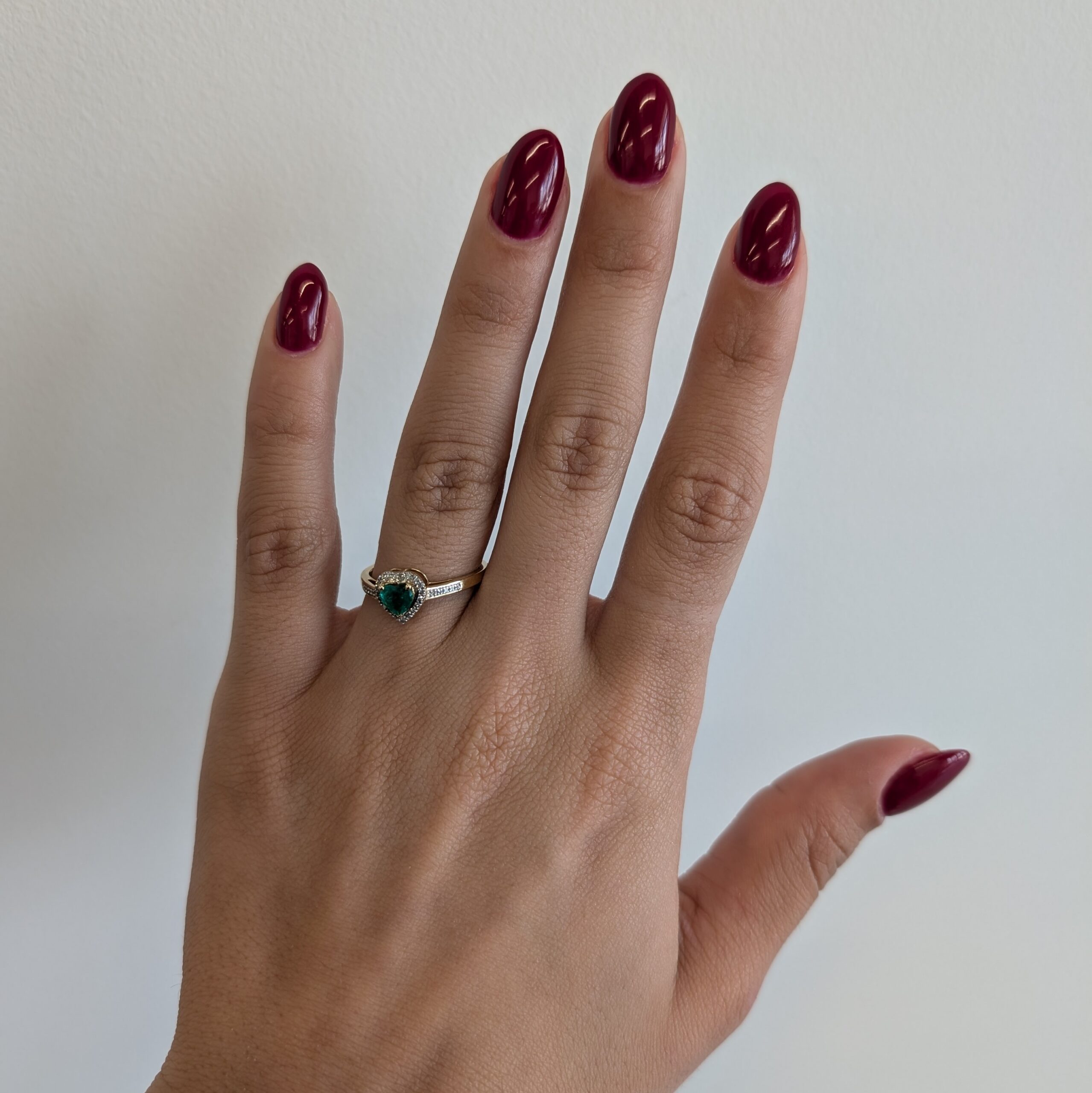 Anillo c/ Corazon de Esmeralda (0.40 Ct) c/ Halo & Aro de Diamantes (0.10 Ct) – Oro Amarillo 14Kts