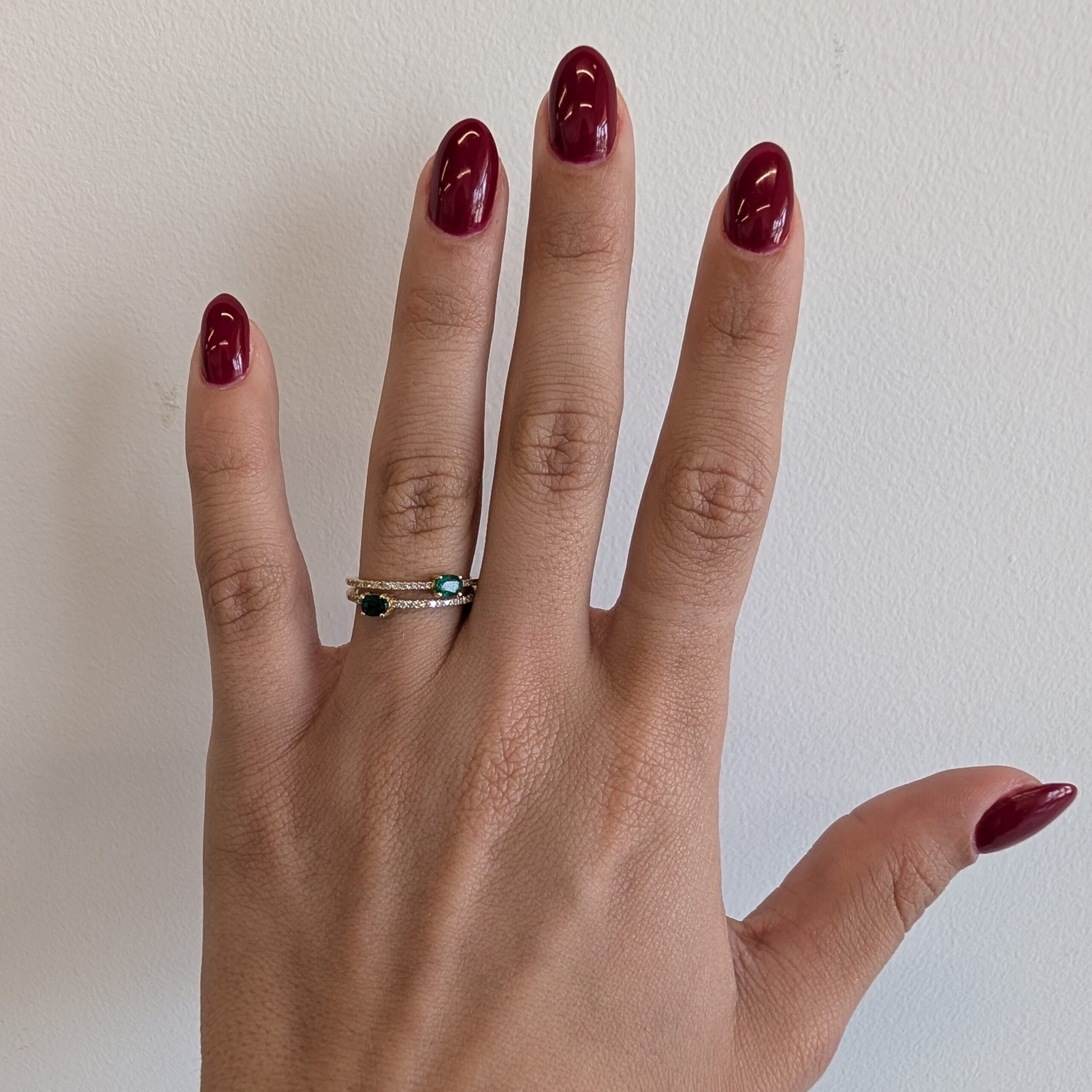 Anillo Doble Linea Diamantes Pave (0.10 Ct) & Dos Esmeraldas Ovaladas (0.20 Ct) – Oro Amarillo 14Kts
