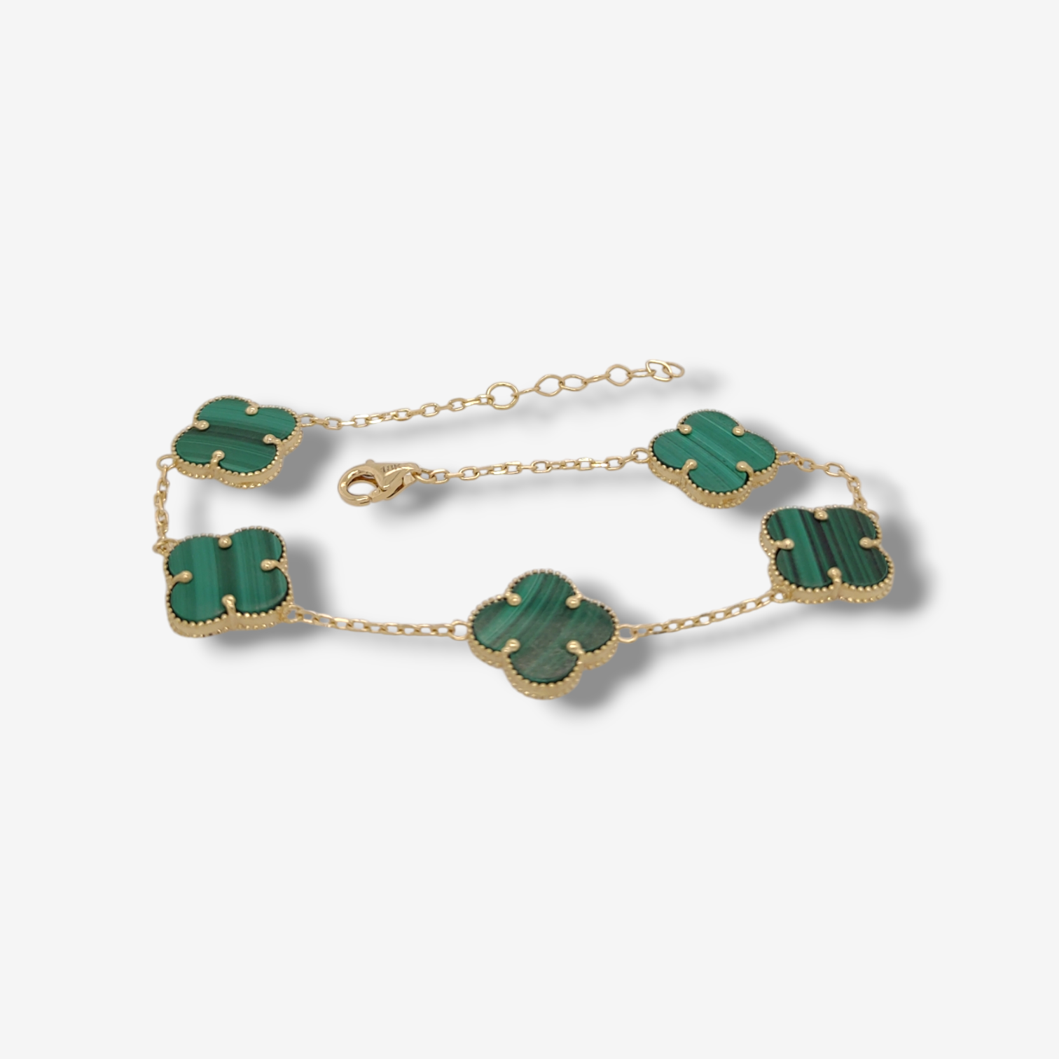 Brazalete (13 mm) 5 Treboles Malaquita c/ Cierre Lobster – Oro Amarillo 18Kts