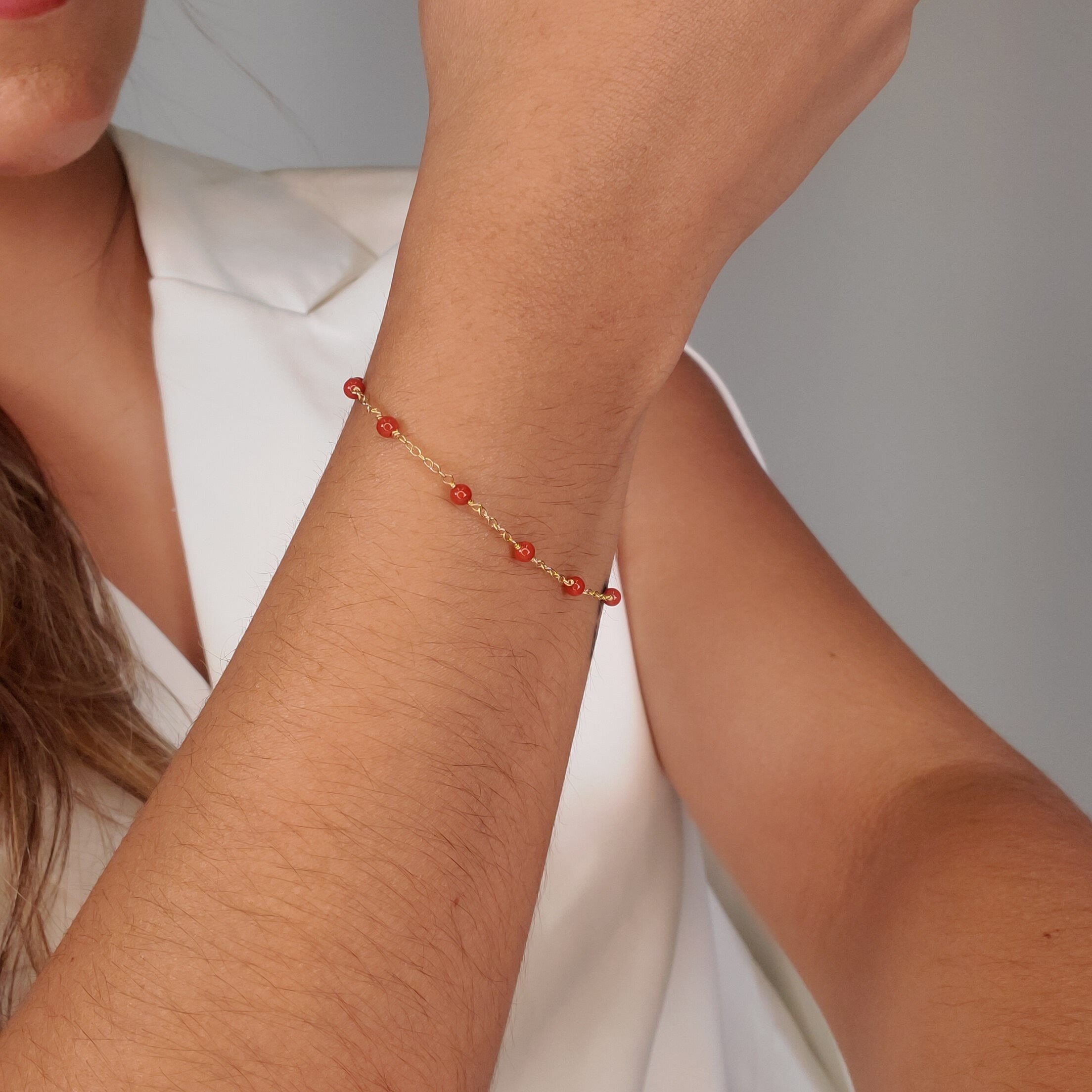 Brazalete (17.5 cm) Tejido Rolo c/ Corales Rojos (3 mm) & Cierre Spring – Oro Amarillo 14Kts