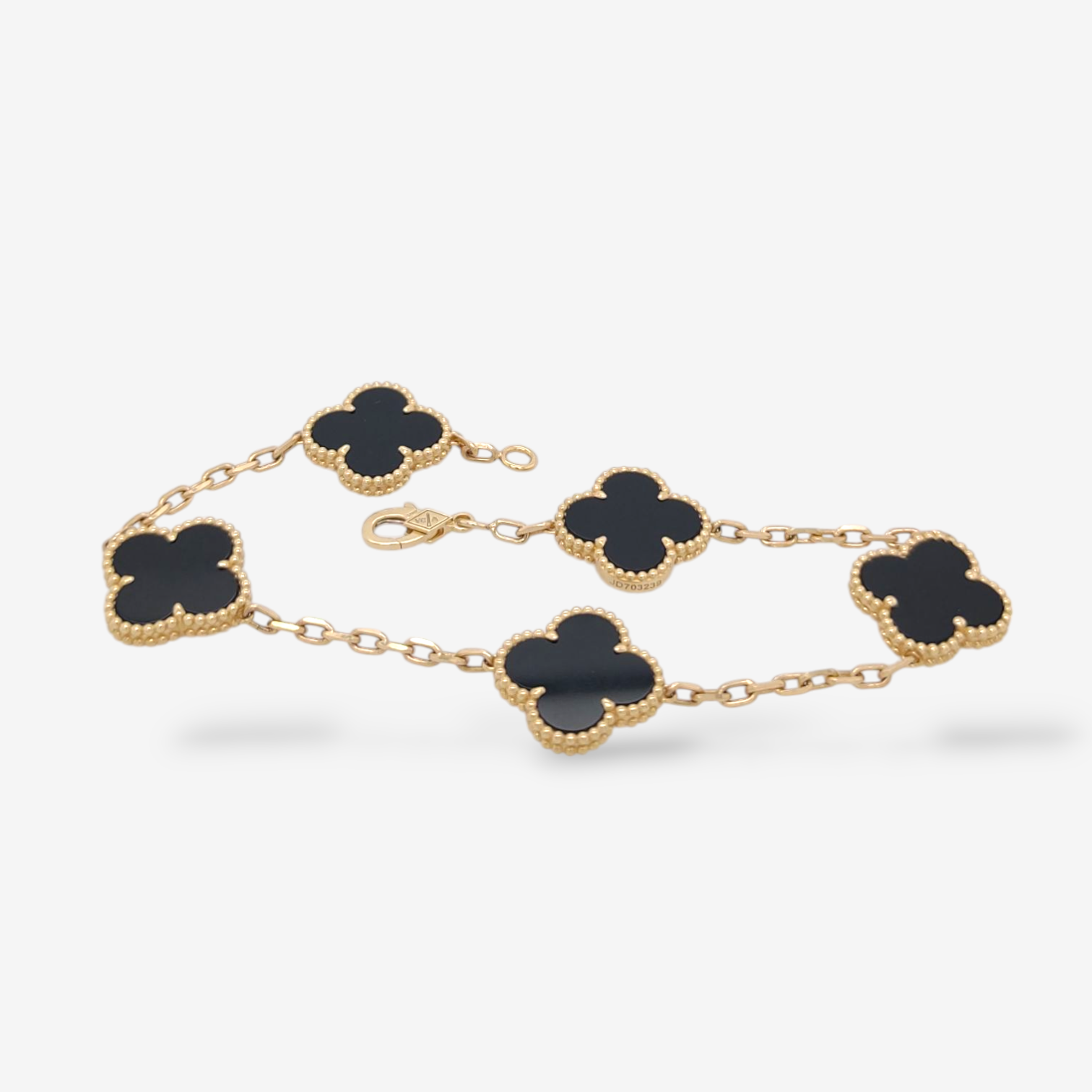 Brazalete (18 cm) 5 Treboles Onix (15 mm) c/ Cierre Lobster – Oro Amarillo 18Kts