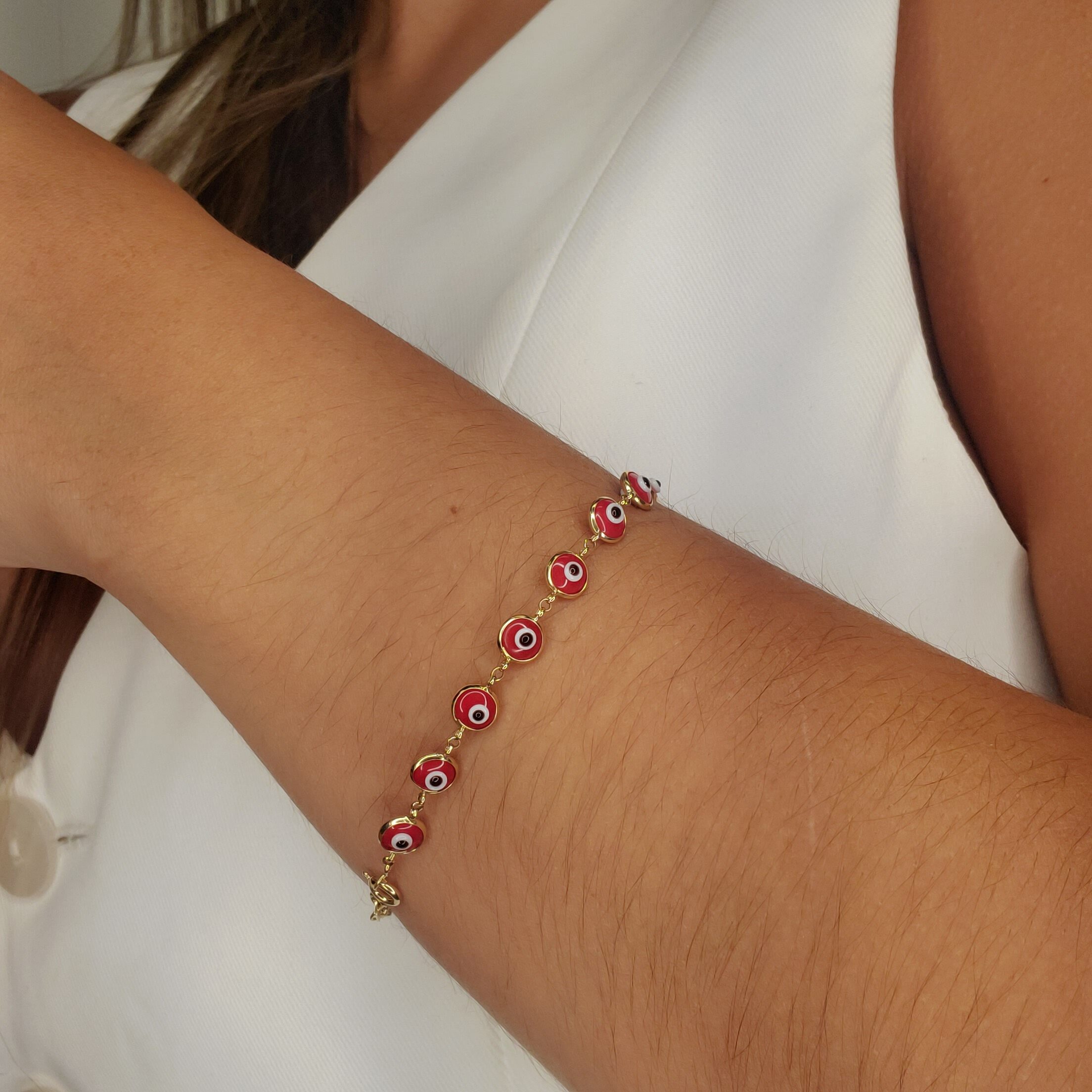 Brazalete (18 cm) c/ 16 Ojos Turcos Rojo (6 mm) c/ Cierre Spring – Oro Amarillo 18Kts