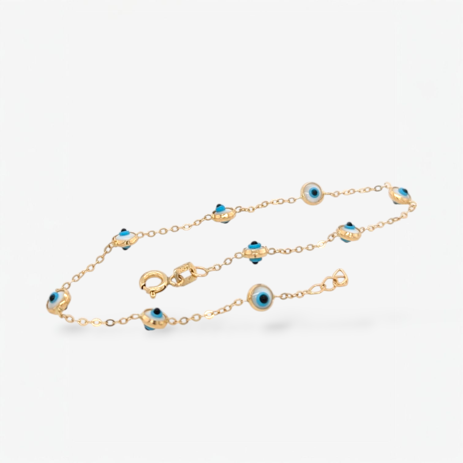 Brazalete (19.5 cm) c/ 9 Ojos Turcos Blancos (4.7 mm) c/ Cierre Spring – Oro Amarillo 18Kts