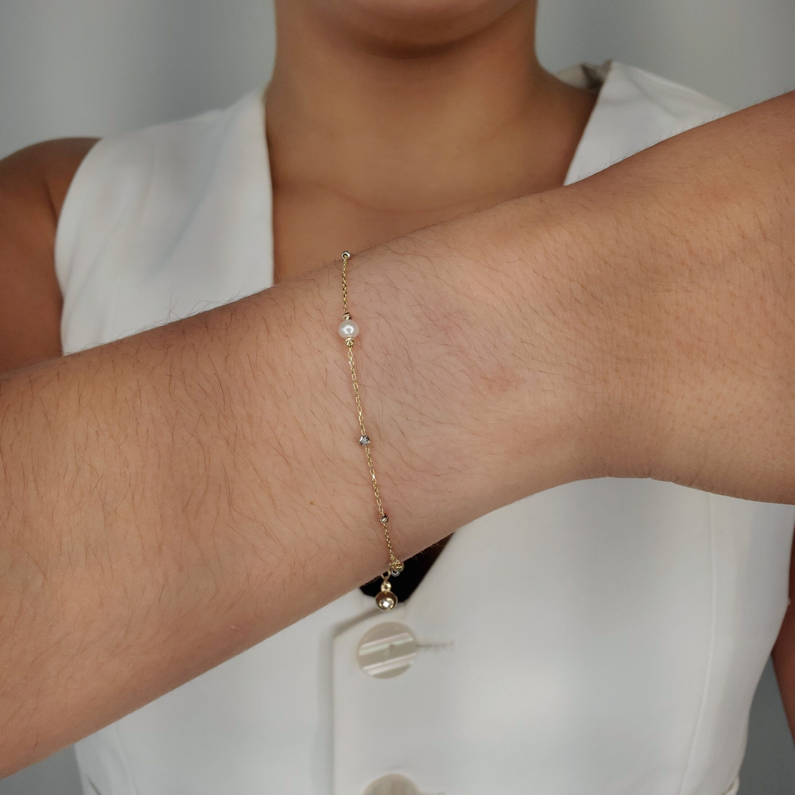 Brazalete (19.5 cm) Cadena Fina Cable c/ Esferas Mini (1.9 mm) & Perla Central (3.8 mm) – Oro Tres Tonos 14Kts