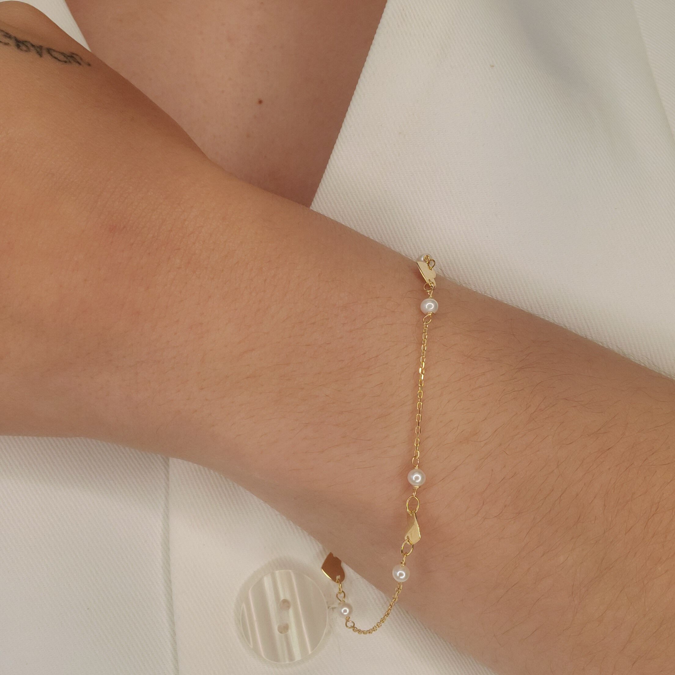 Dimensiones: Largo 18.5 + 1 cm Extension ; Perlas 3 mm; Corazones 5.5 x 6.5 mm