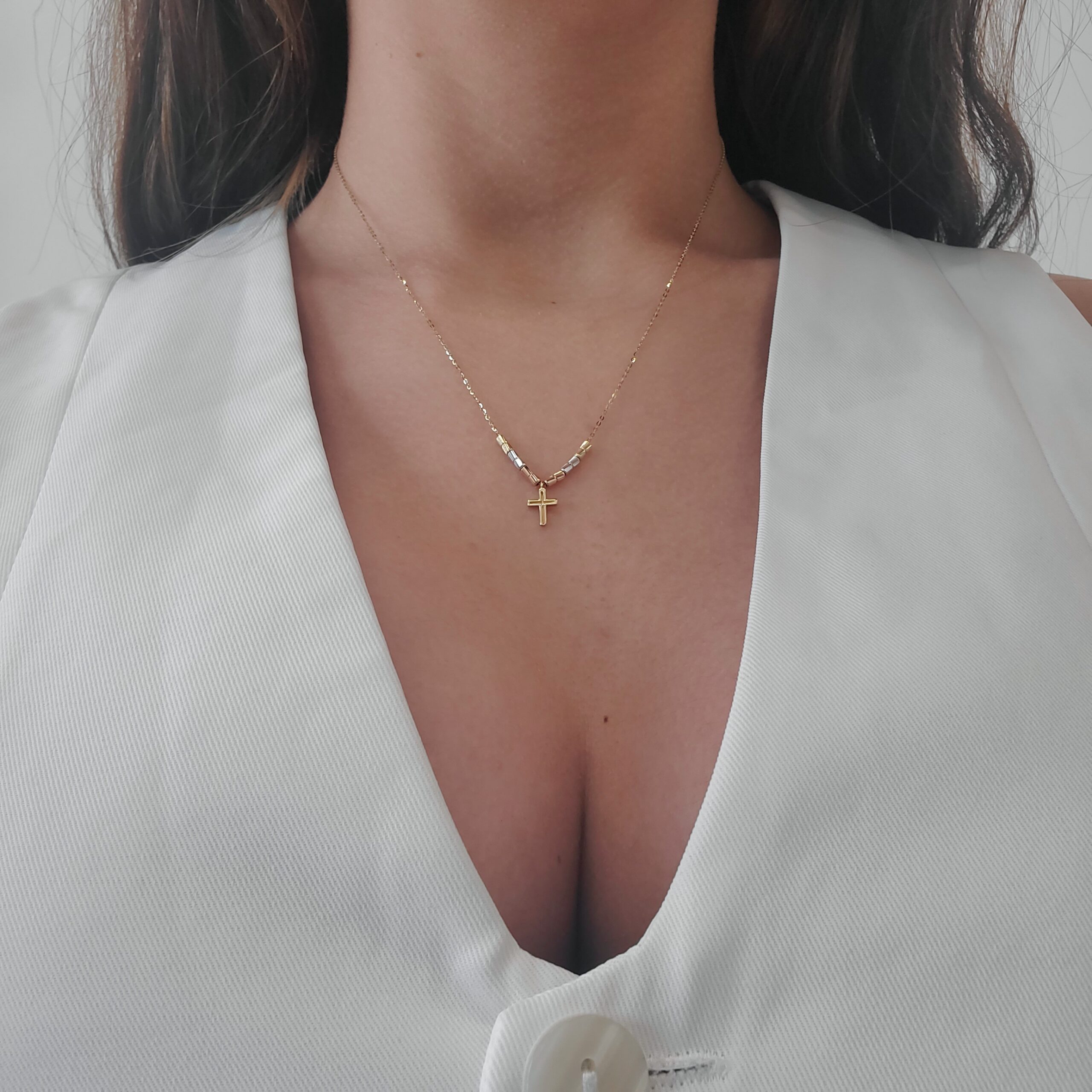 Cadena (45 cm) c/ Cruz Mini (6 x 8 mm) & Barril Diamantado c/ Cierre Spring – Oro Tres Tonos 14Kts