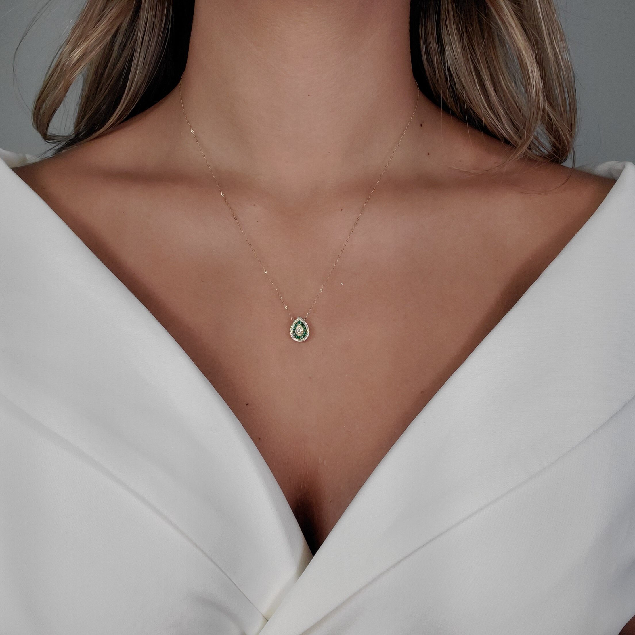 Dimensiones: Cadena 45 cm; Esmeralda 0.20 Ct; 8.5 x 11 mm; Diamantes 0.11 Ct