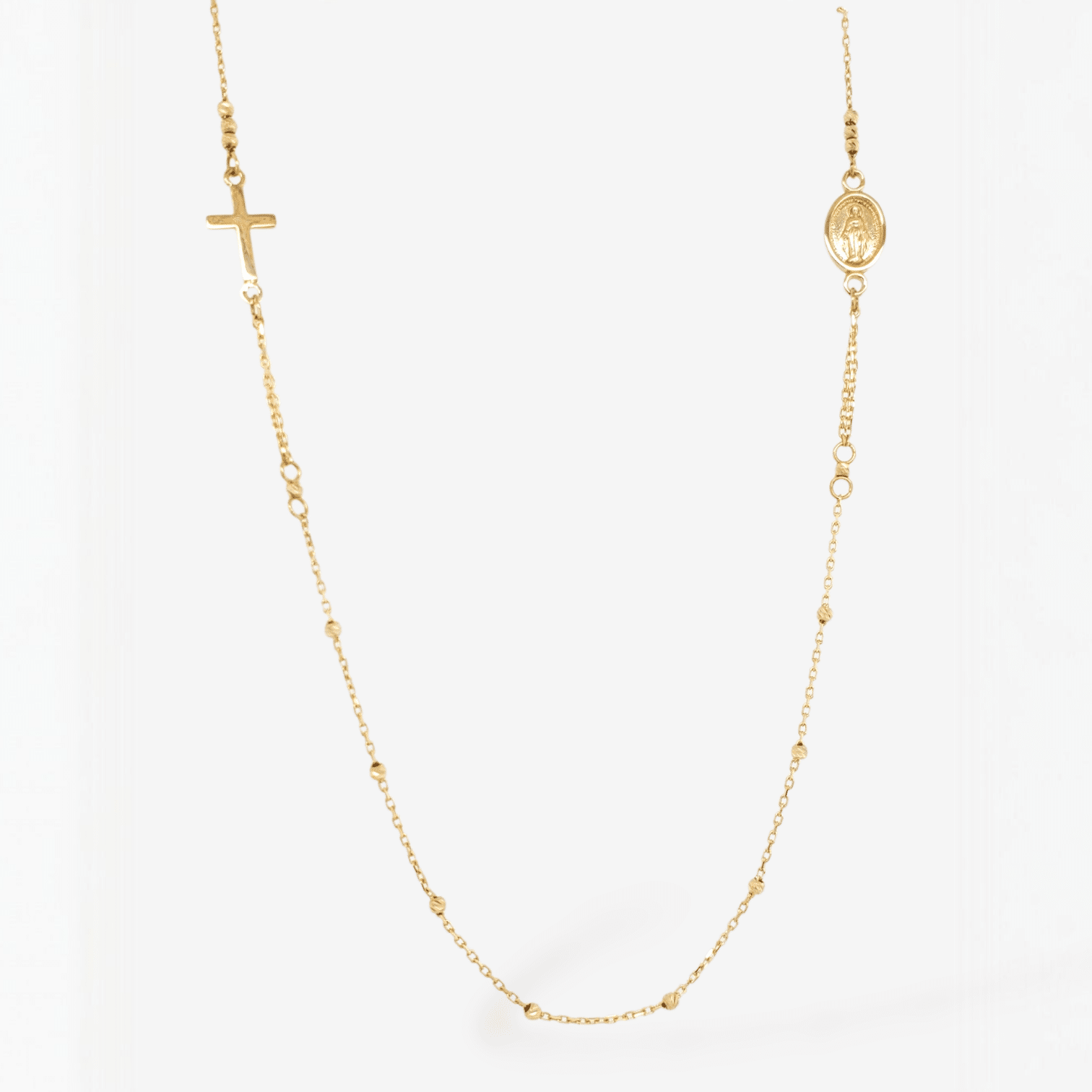 Cadena (45 cm) Rosario Pasante c/ Esferas Diamantadas (1.5 mm) Medalla Milagrosa & Cruz – Oro Amarillo 14Kts