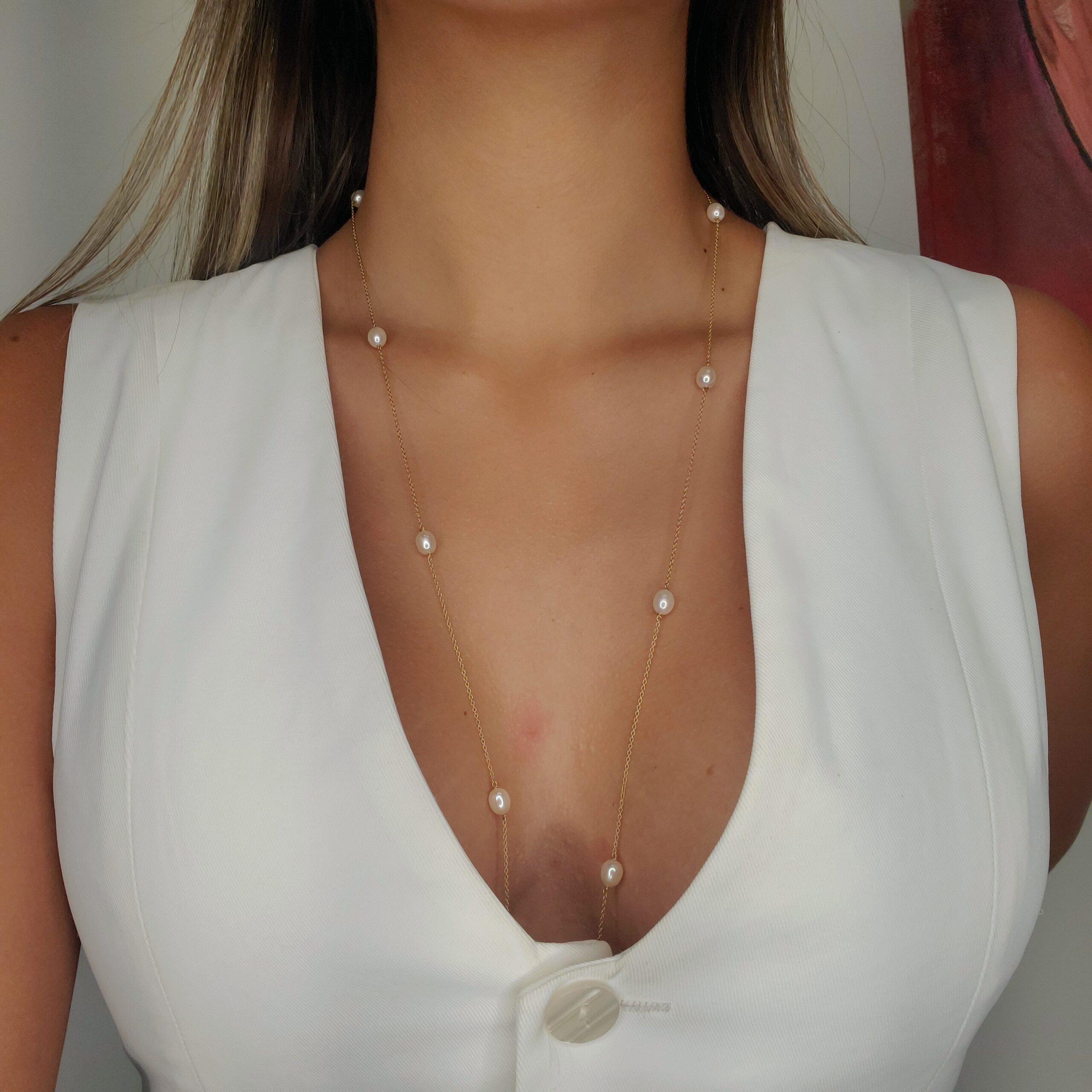 Cadena (75 cm) Cable Fina c/ Perlas Cultivadas (5.7 x 7.3 mm) & Cierre Lobster – Oro Amarillo 18Kts