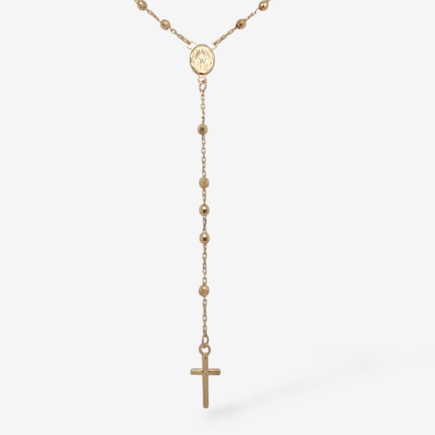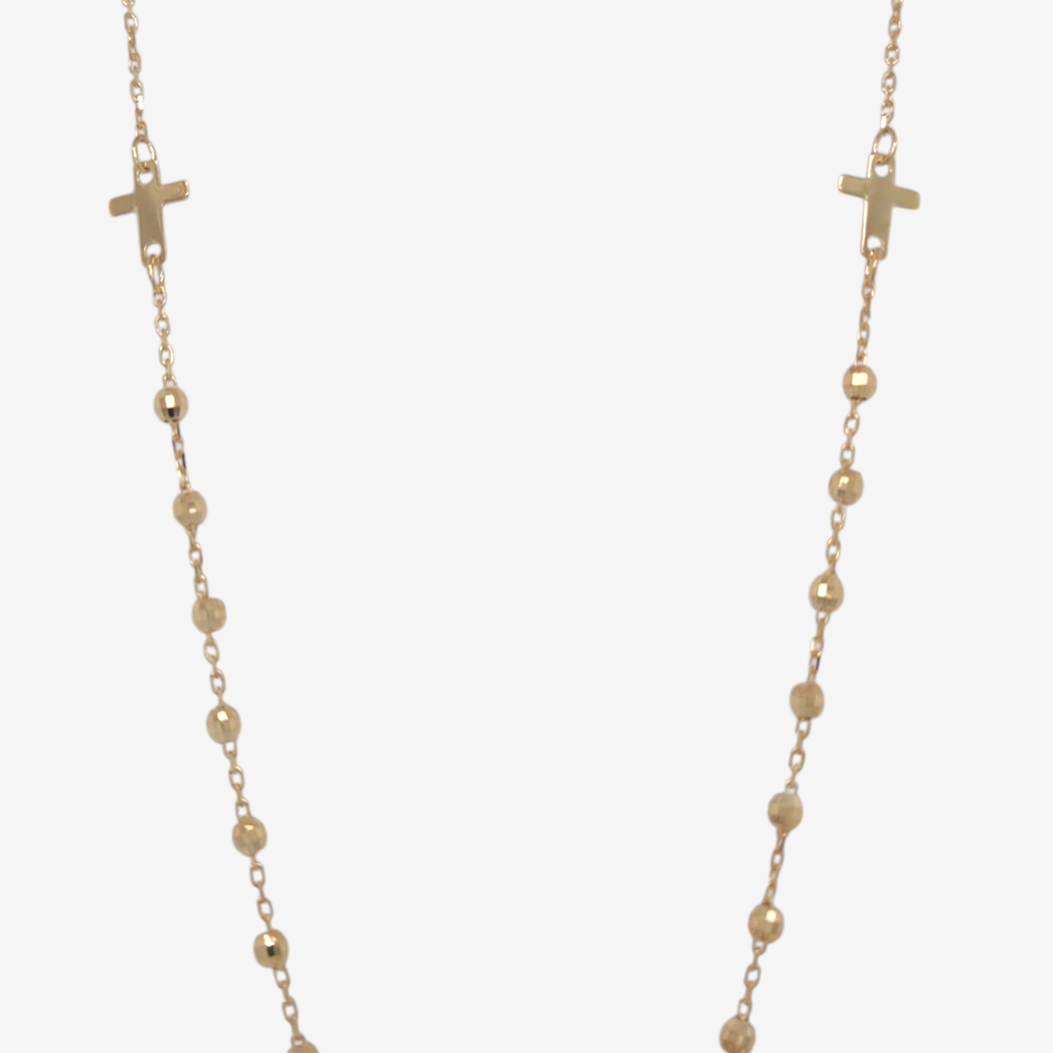 Cadena Fina Cable Tipo Rosario c/ Vitela Milagrosa & Tres Cruces c/ Esferas Diamantadas – Oro Amarillo 14Kts