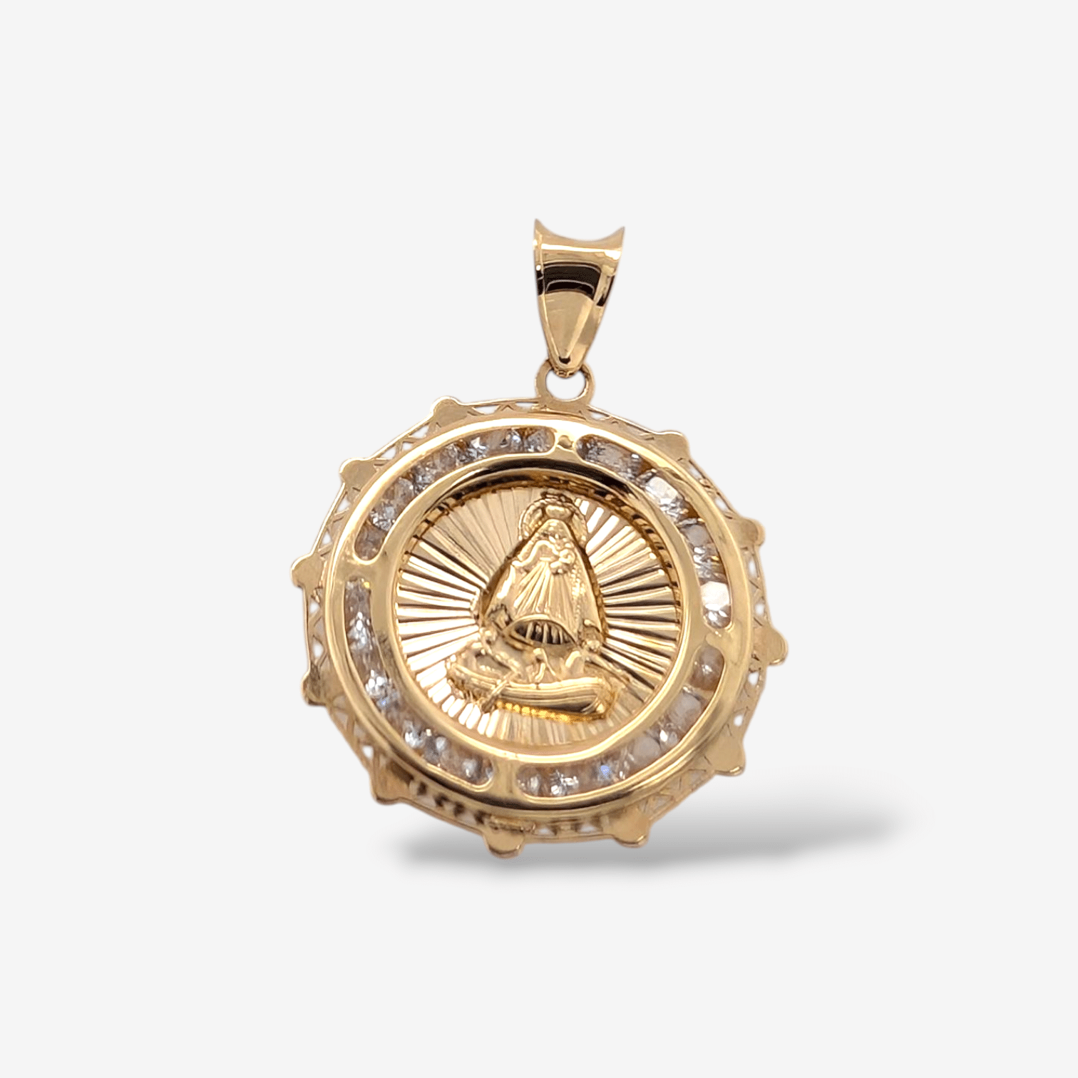 Medalla (18 mm) Virgen de Caridad del Cobre c/ Marco de Zircones – Oro Amarillo 14Kts