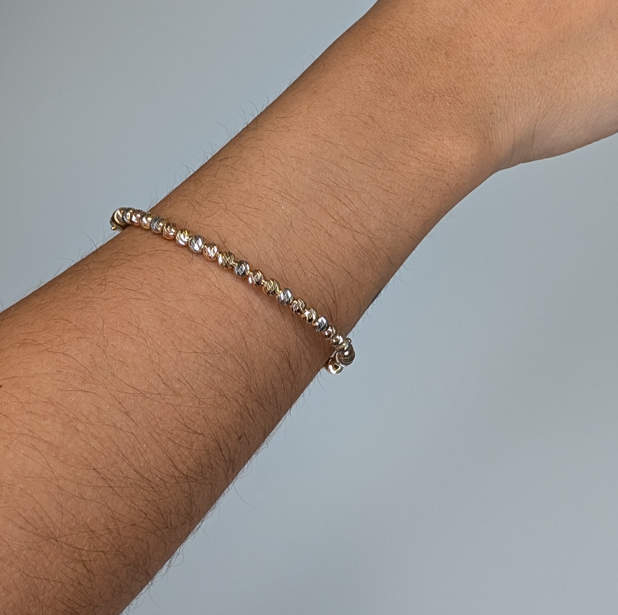 Pulsera (#19) Bangle Tubo Redondo (2.5 mm) c/ Esferas Diamantadas (3.9 mm) – Oro Tres Tonos 14Kts