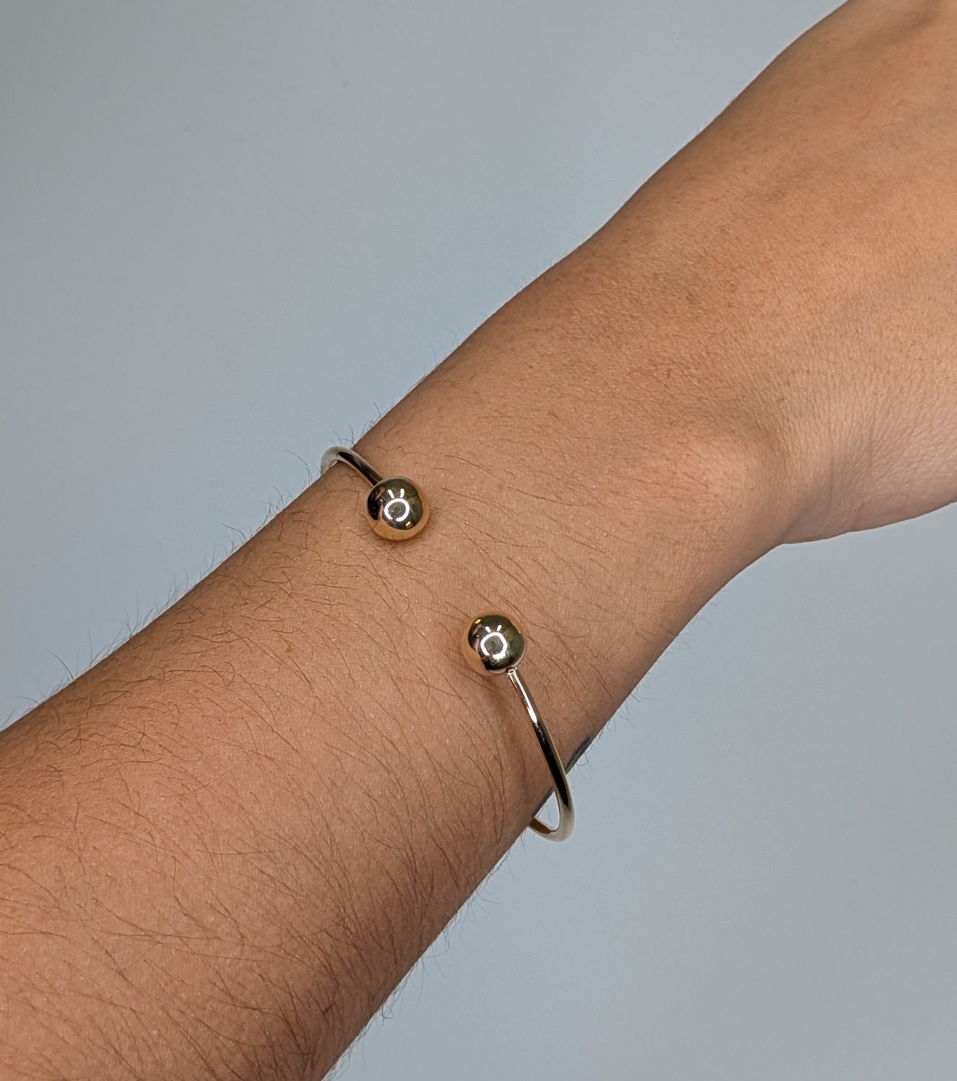 Pulsera (2 mm) Bangle Abierta Tubo Redondo c/ Terminales & Esferas (8 mm) – Oro Amarillo 14Kts